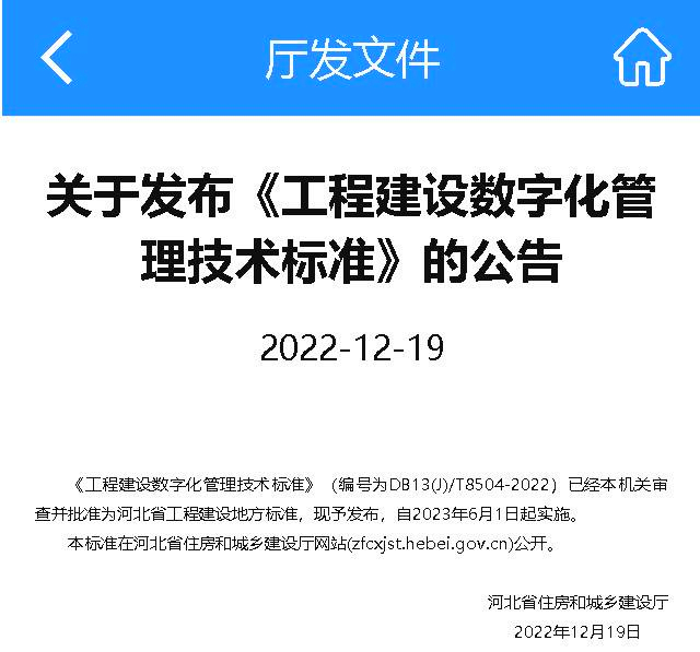 2022年12月19日,由河北省建筑科學(xué)研究院有限公司、河北省住房和城鄉(xiāng)建設(shè)廳信息宣傳與檔案中心和北方工程設(shè)計研究院有限公司共同主編的《工程建設(shè)數(shù)字化管理技術(shù)標(biāo)準(zhǔn)》(編號為DB13(J)/T8504-2022)已經(jīng)河北省住房和城鄉(xiāng)建設(shè)廳審查并批準(zhǔn)為河北省工程建設(shè)地方標(biāo)準(zhǔn),自2023年6月1日起實施。