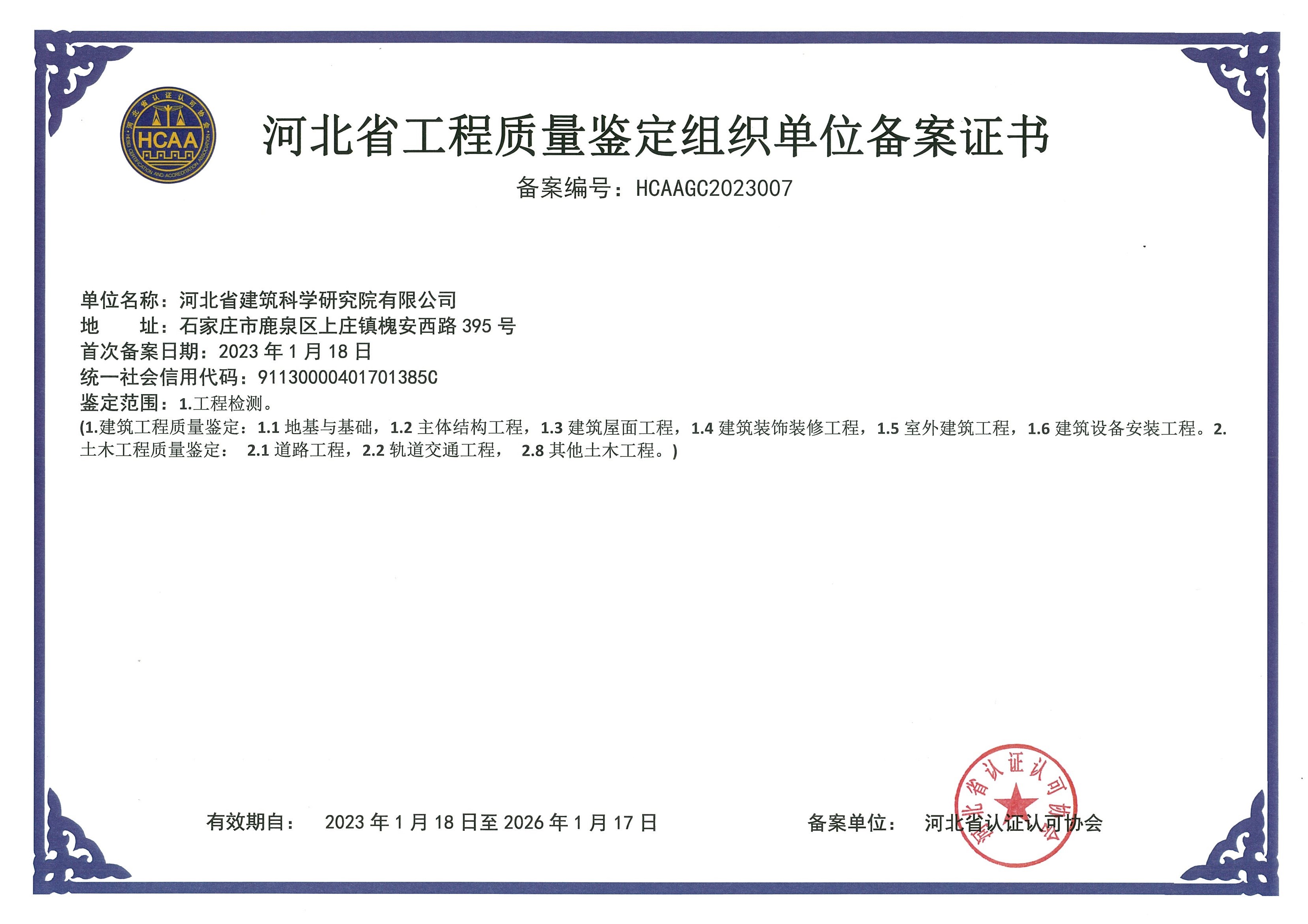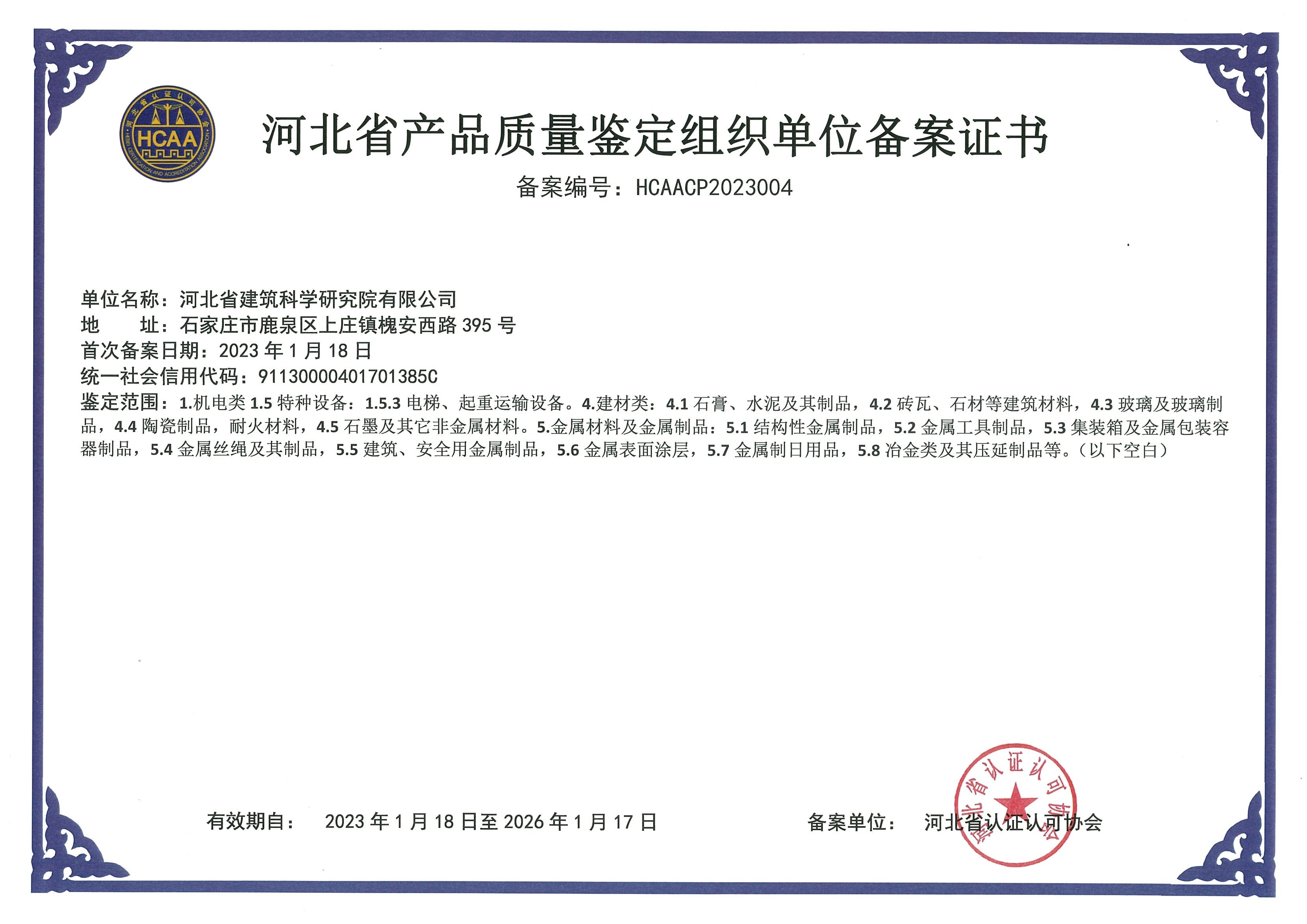 河北省建筑工程質(zhì)量檢測中心產(chǎn)品質(zhì)量鑒定組織單位備案證書1