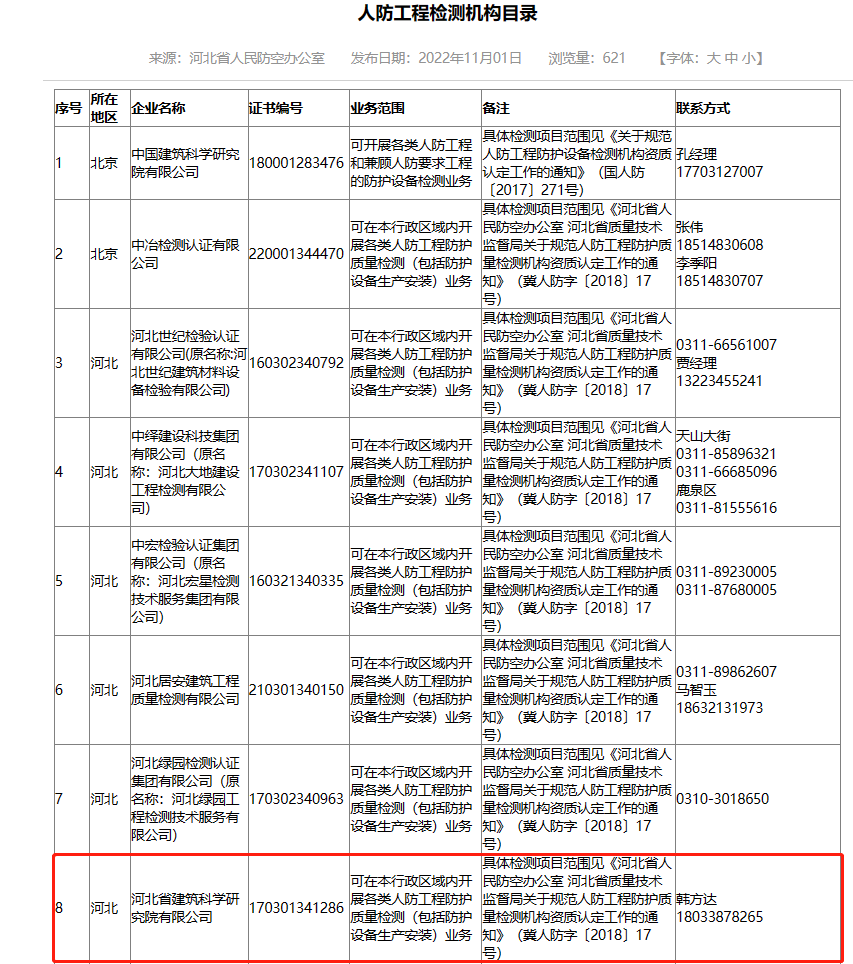 河北省建筑科學(xué)研究院有限公司人防工程檢測機構(gòu)證明